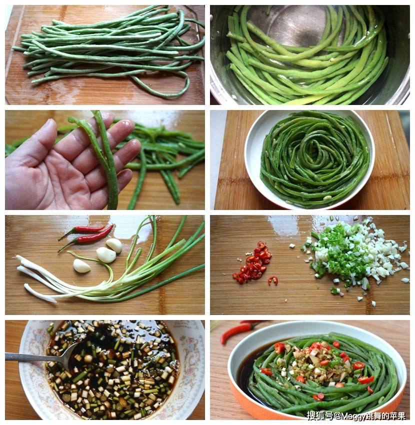 材料:豇豆1把,大蒜3瓣,香葱数棵,小米辣2个,醋、生抽、盐、白糖、白开水 1. 豇豆洗净,从中间用手撅断,一分为二; 2. 入开水锅中,充分煮透,完全变色变软再捞出,冲凉水后又嫩又绿; 3. 顺着豇豆的经络,手撕成两条,豇豆只有充分煮熟煮软才能轻易撕开; 4. 豇豆全部撕成两半了,手握一把豇豆,顺势盘成一圈在盘中; 5. 香葱、大蒜、小米辣清洗干净; 6. 大蒜拍扁剁碎,香葱、小米辣切碎圈; 7. 将大蒜末、香葱末入碗中,倒入适量的醋、生抽、少许盐、一小勺白糖,少量白开水,混合均匀;小米辣很辣,如果家里人有不能吃太辣的,可以随后撒在豇豆上; 8. 将调好的料汁淋在豇豆上,再撒上小米辣,又漂亮,还能降低辣度。