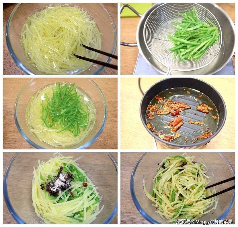 7. 过凉水两遍,经过这样处理的土豆丝爽脆嫩; 8. 青椒丝在开水中焯烫3秒即捞出; 9. 同入土豆丝水盆中,控水备用; 10. 另起锅,小火将花椒煸炒出香味,再将干红辣椒碎煸炒至浅褐色; 11. 趁热泼在青椒土豆丝上,再撒适量盐、鸡粉、淋少许米醋、蚝油; 12. 拌匀即可食用。