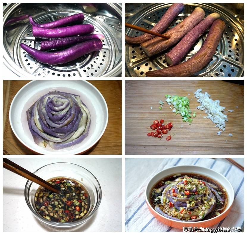 材料:长茄子2根,大蒜4瓣,小葱1棵,小米辣2个,醋适量,生抽少许,盐少许,芝麻油少许 1. 长茄子上锅蒸,如果太长就切两半; 2. 蒸大约7、8分钟时,筷子能轻松扎透茄子最厚的地方就可以关火了; 3. 稍微晾晾,顺着茄子丝撕成茄子条,盘绕在盘子里,茄子会出汤,别倒,都是营养; 4. 大蒜、小葱、小米辣切碎,如果能用蒜杵子把蒜捣碎,味道更香; 5. 将蒜葱小米辣入碗中,根据口味倒适量醋,少许生抽、少许盐,调成碗汁,倒在茄子上,最后淋上少许芝麻油。