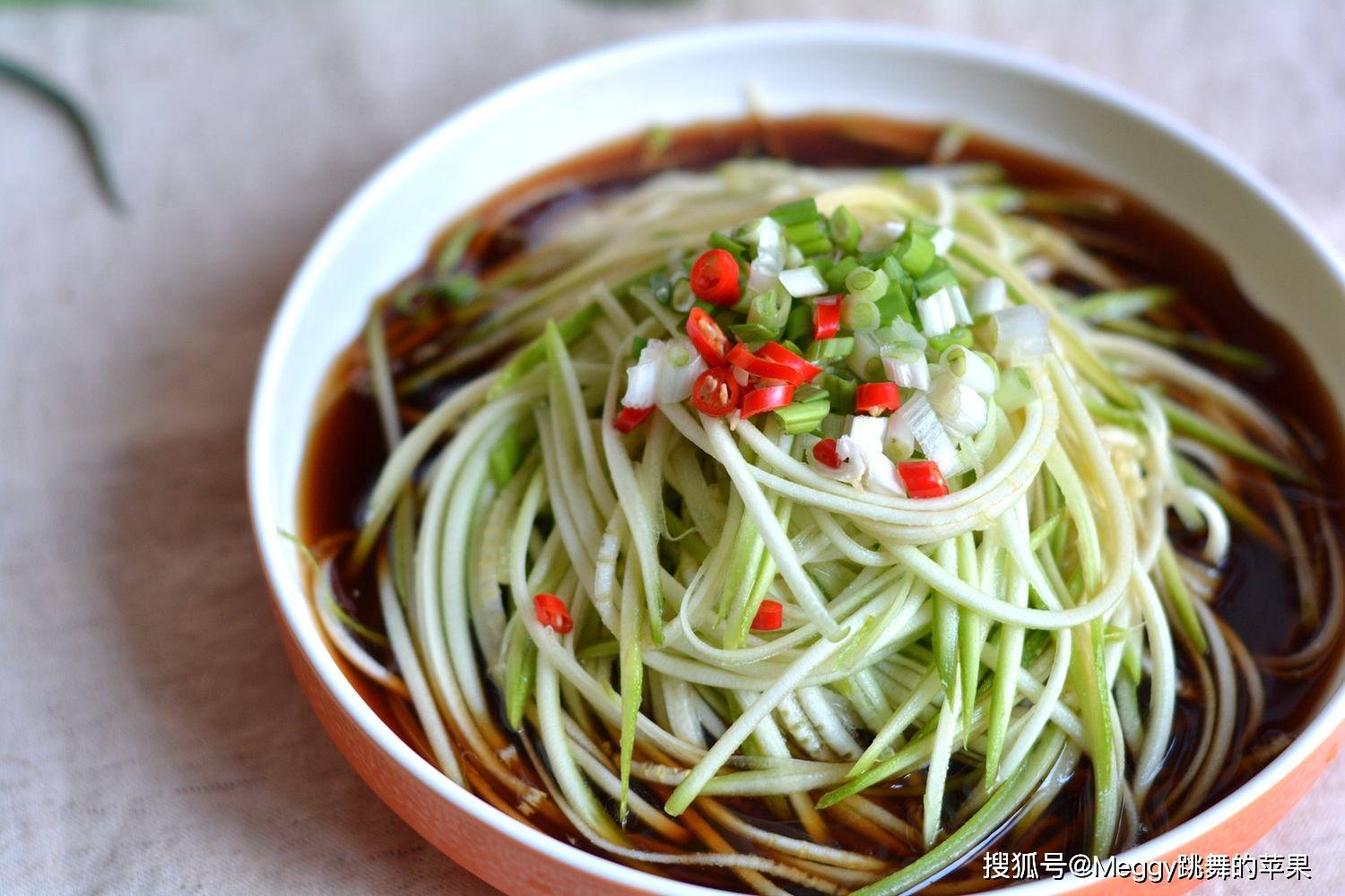 材料:西葫芦1个,小米椒1个,小葱1根,生抽、醋、白糖 1. 西葫芦、小米椒、小葱洗净; 2. 用擦丝器将西葫芦擦成长长的粗丝,中间的芯不擦,太软,口感不爽利,可别做它用; 3. 小米椒、小葱切粒; 4. 生抽、醋、白糖同入一碗,小勺混合均匀,尽量使白糖溶化,比例可随口味调整; 5. 西葫芦丝入盘中,撒上小葱、小米椒,将料汁淋在上面。