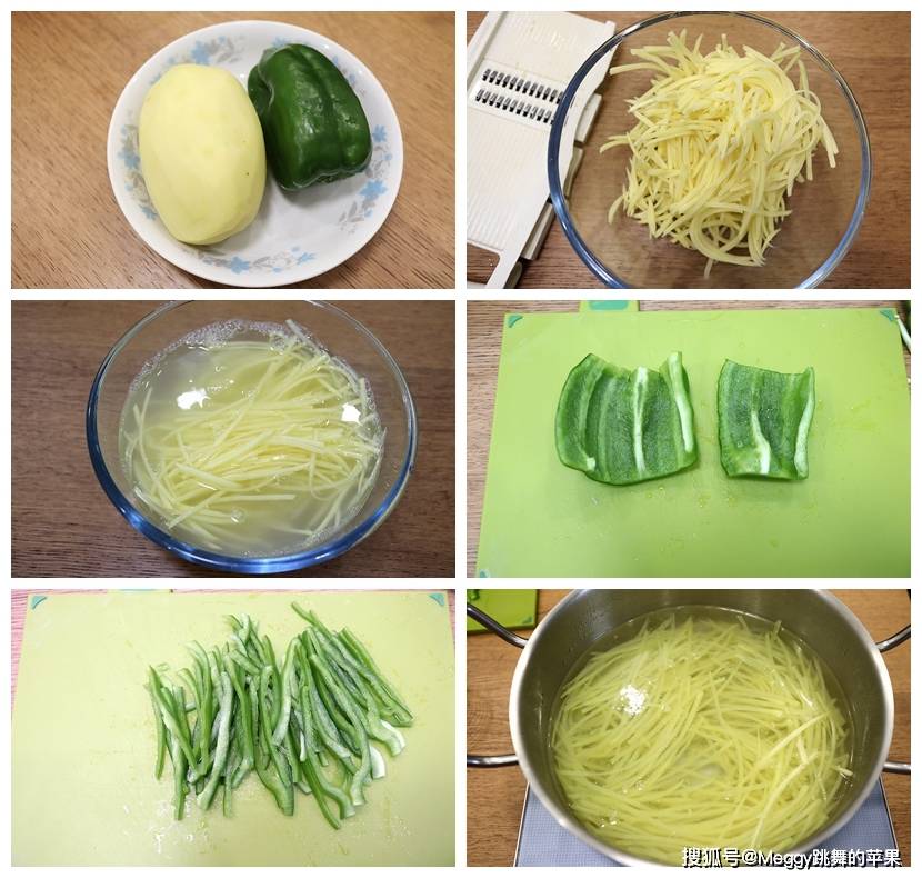 材料: 黄心土豆1个,青椒1个,油20克,花椒1撮,干红辣椒1个,盐适量,米醋10克,蚝油10克,鸡粉1小勺 1. 黄心土豆削皮洗净,青椒洗净; 2. 用擦丝器将土豆擦长丝;擦丝器一般有粗细两种刀头,用粗一点儿的口感更好; 3. 浸泡在凉水中10分钟; 4. 青椒去两端、去籽; 5. 切细细的丝; 6. 烧一锅水,水开后将沥过水的土豆丝入锅,焯煮至变色捞出;