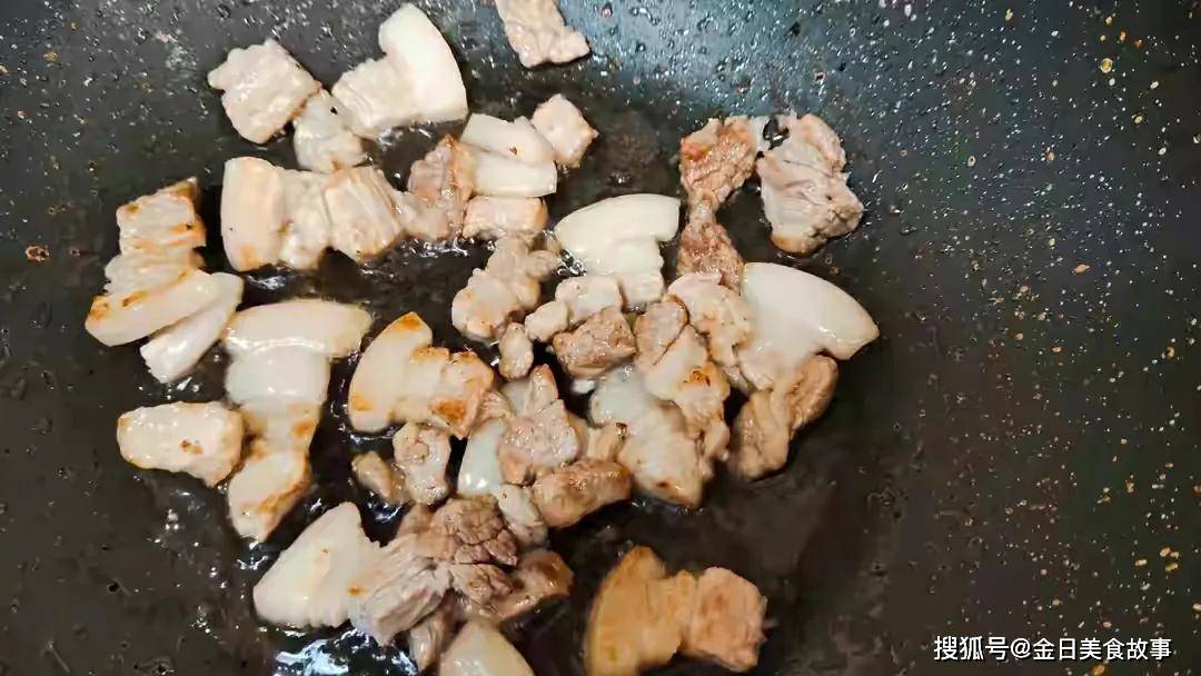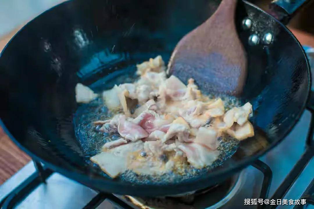 6.随着猪肚的五分,然后放入里面的小烹饪葡萄酒,然后喷洒一点酱油颜色。适量的水加入到内部。 Fry的Fry不容易改变。