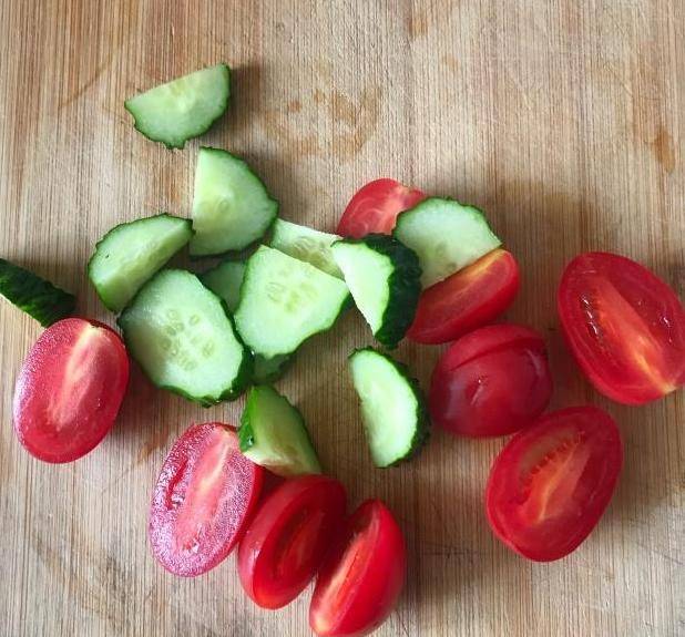4、 把黄瓜切成小片,不需要太薄,最好是有一定的厚度,圣女果对半切开,放入盘中备用。把牛油果切开去核,切成小块,放入盘中备用。