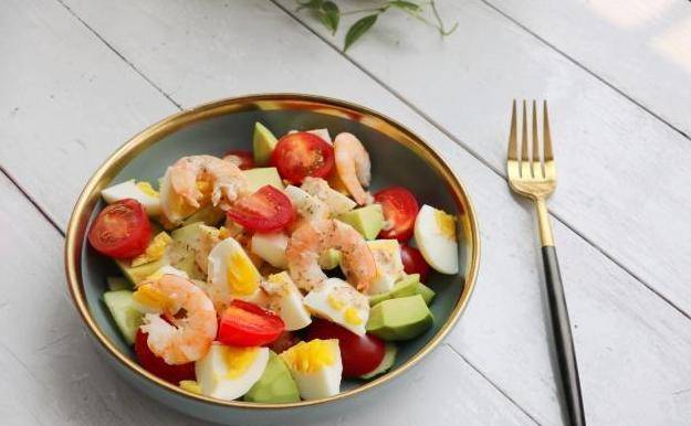 【食材】牛油果1个,鸡蛋2个,大虾4只,圣女果5个,黄瓜半根,沙拉汁20克