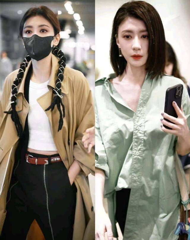 具体方法是露出内搭领口或下摆,增加视觉层次。贾静雯曾用条纹衬衫叠穿黑色吊带,配黑色阔腿裤,看似随意的叠穿,实则暗藏‘上宽下窄’的显瘦心机。
