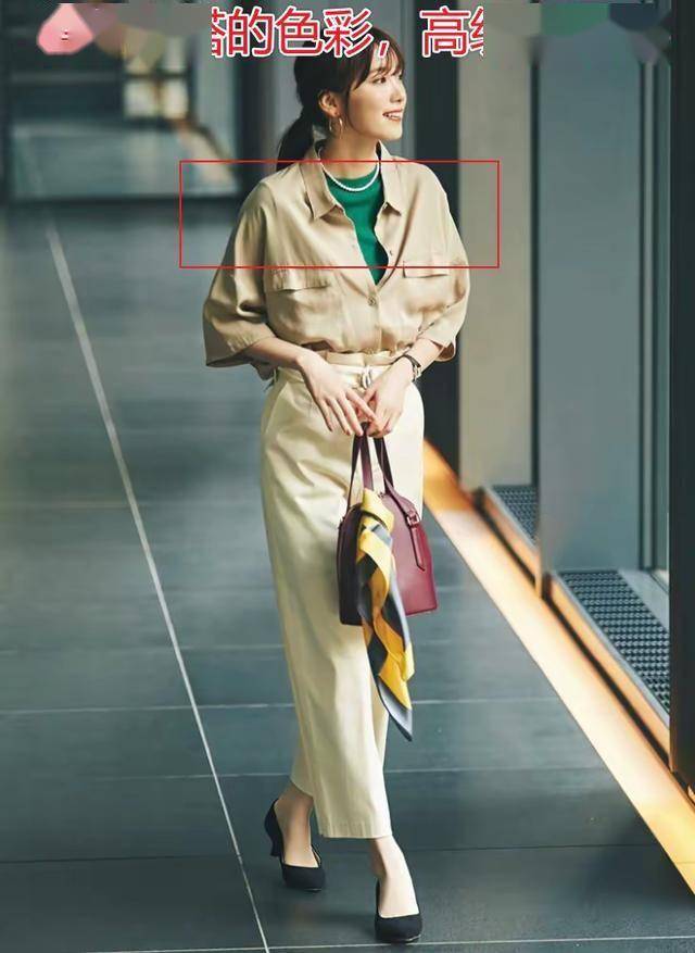 领口这一块,大家可以解开2-3颗纽扣,形成V领效果,拉长脖颈线条,V领设计可使脸部视觉显瘦15%。