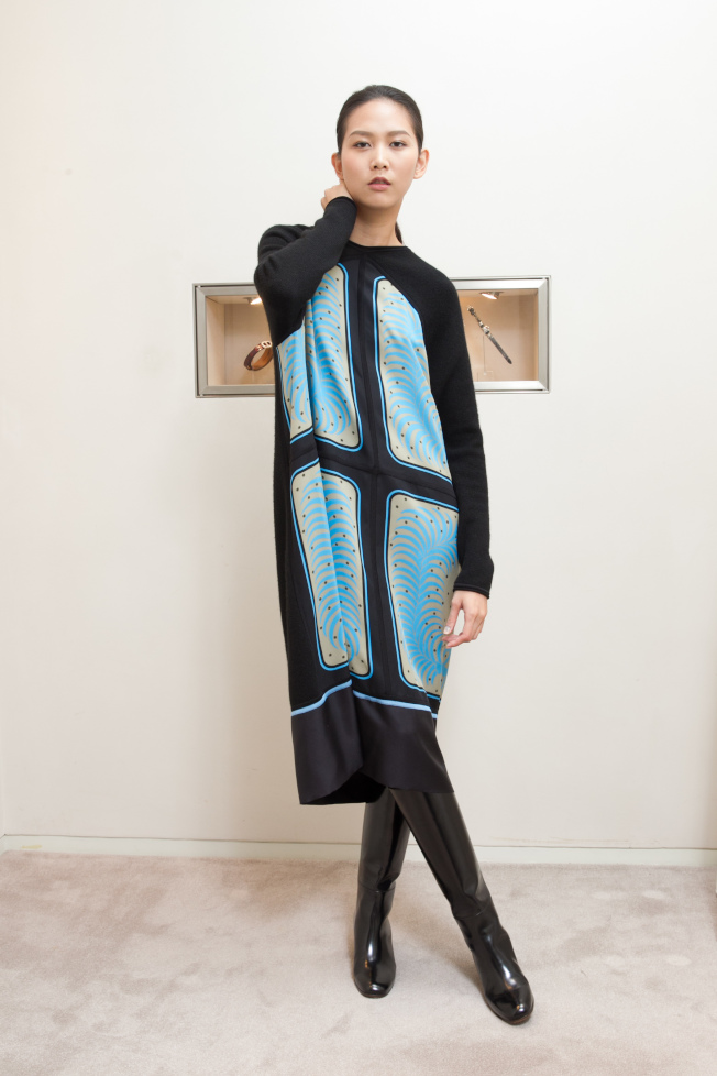 上衣或短版騎士風夾克上的菱格紋式剪裁或圖形,則源自品牌過去為馬術騎士製作的上衣Casaque,巧妙延續了Hermes馬術精髓;另外也受50年代的美國藝術家Barnett Newman的抽象表現主義啟發,運用抽象幾何藝術於鑲嵌工藝的雙面作工喀什米爾羊絨混搭小羊皮,以及品牌經典的結合針織與印花絲巾Twillaine材質的上衣與連身洋裝等細節中。