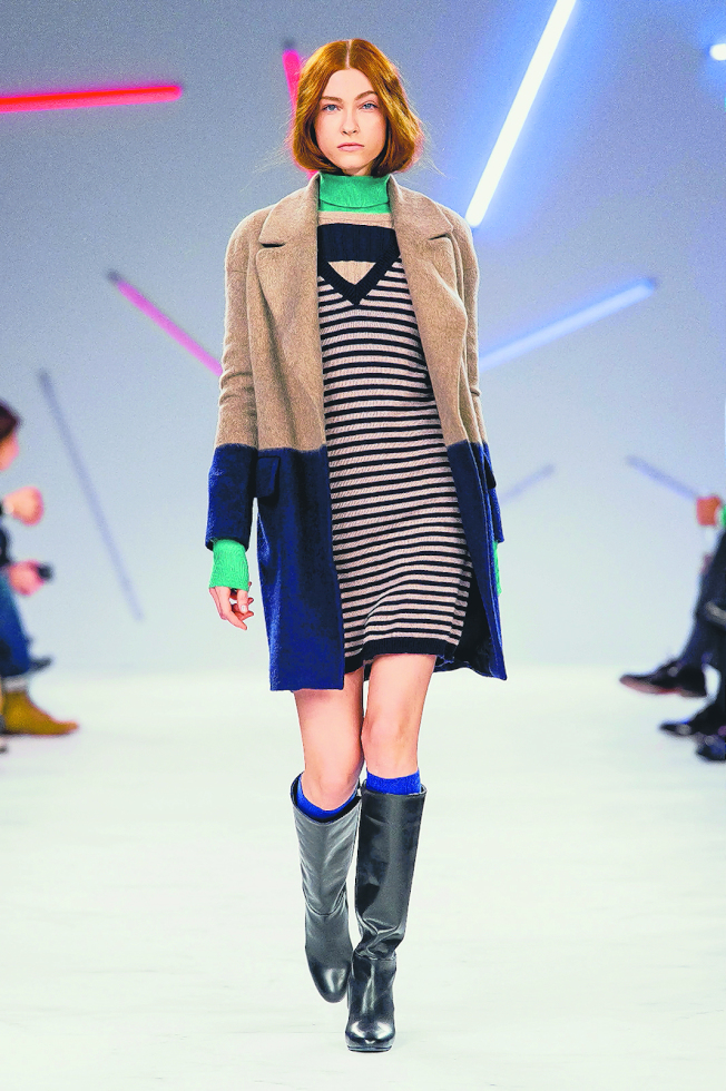 撞色大衣、横纹毛衣、横纹洋装。