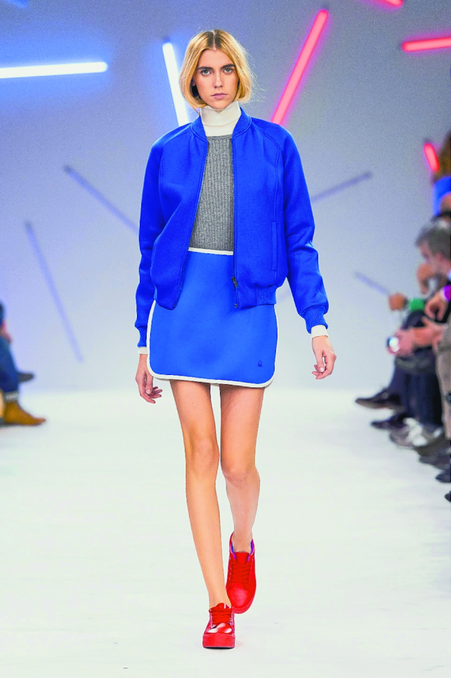 亮蓝夹克、蓝白短裙、亮红休闲鞋。
