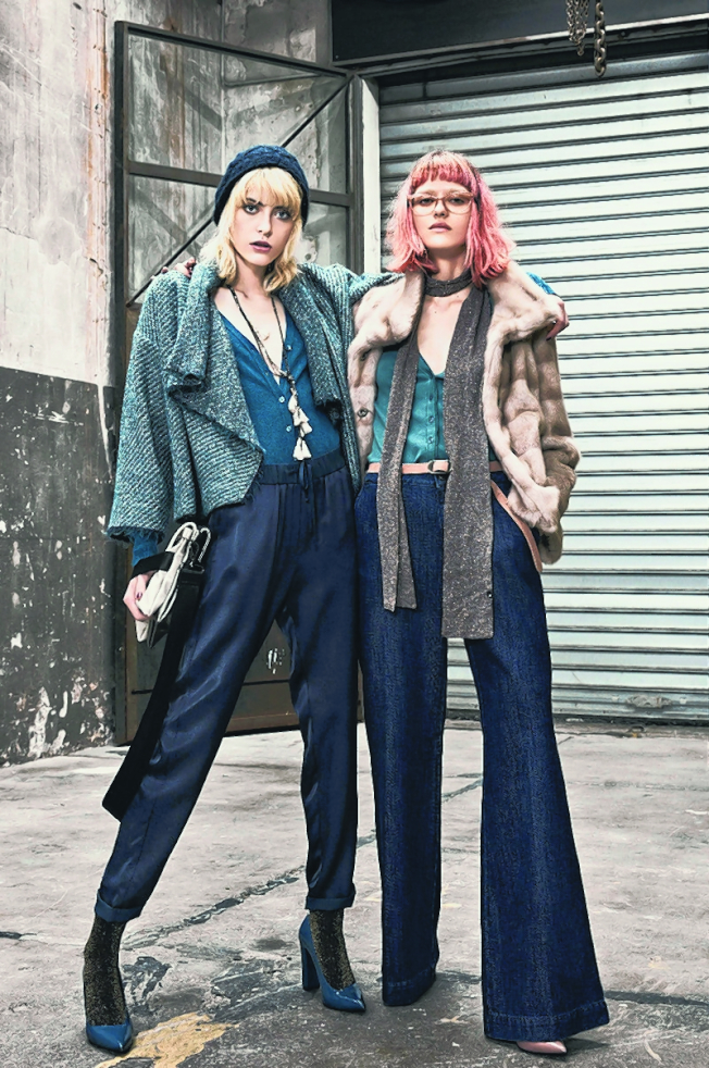 (左)不规则领边外套、深蓝休闲长裤、手拿肩背包。(右)渐层环保短毛大衣、丹宁长裤、牛皮皮带。
