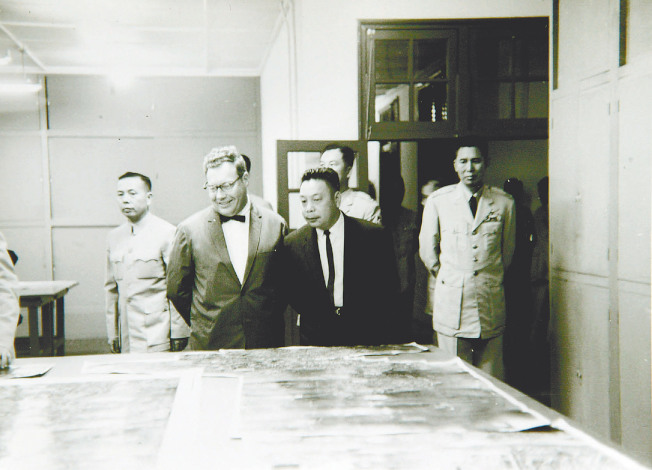 中华民国国防会议副秘书长蒋经国(前右)与中情局台北站站长克莱恩(前左),1961年11月观看U-2侦察机拍回的空照图。(报系档案照片,国民党党史馆提供)