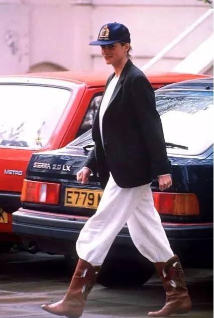 1989年她身穿宽大的白色休闲裤并把它塞入靴子中,头戴棒球帽看起来十分随意而帅气,出发去学校见孩子们。这就是戴安娜,即使身在皇家,也像一个普普通通的母亲和时髦的主妇,而不是一个皇室人偶。