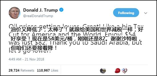 特朗普周三发推庆祝最新一轮油价下跌,并呼吁“再低点”