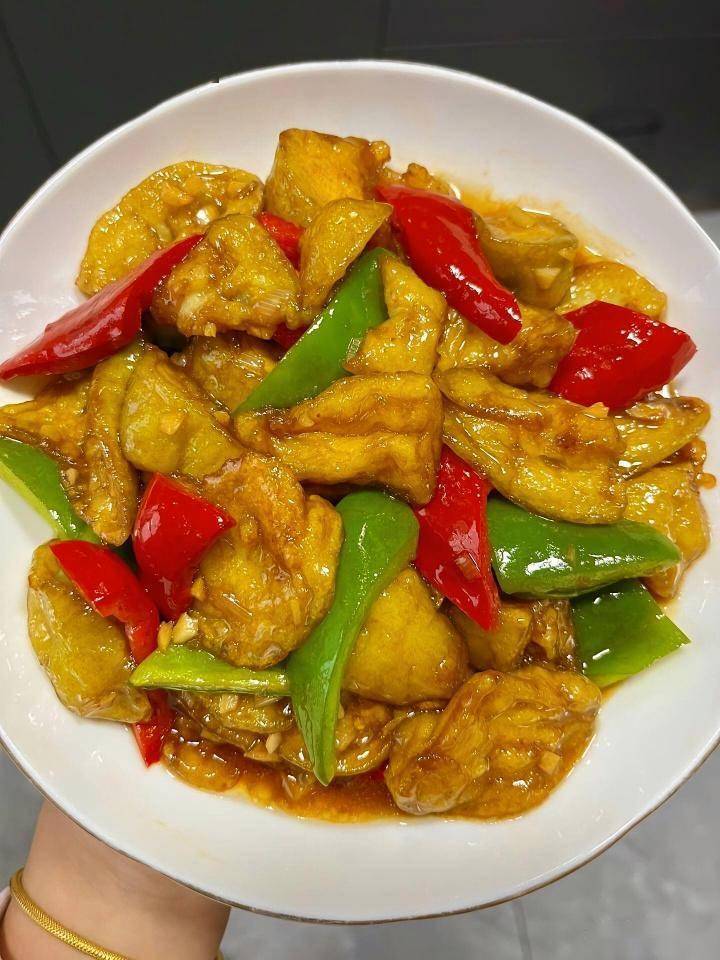 3、锅中烧油,油温六成热,把茄子全部下锅炸,茄子下过之后先不要去动它,让它有一个定型的过程,要不然这个粉就全掉了,炸定型之后再去翻动它,全程中火去炸,大约需要5分钟,把这个茄子炸的金黄酥脆,放入青红椒闯一遍油,再和茄子一起捞出控油。