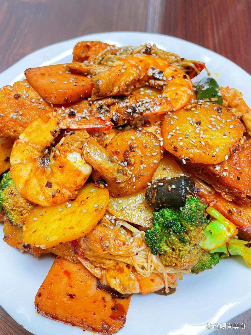 1、准备一个去了皮的土豆,切成1元硬币那么厚的片。锅中烧水,水开加入少许的食用油和盐,放入土豆片,自己喜欢吃的青菜,煮熟后捞出过凉水,再下入各种火锅丸子和大虾,煮熟后捞出,沥干水分备用。