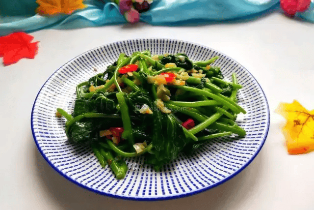 配料: 红薯叶一把、大蒜三瓣、食用盐适量、食用油适量、胡椒粉适量、小米椒一个、鸡精适量 烹饪步骤: 1、.准备食材洗净; 2.生姜切末,小米椒切圈; 3.锅内放油,放入大蒜,小米椒爆香,光是闻着就很有食欲; 4.放入红薯叶翻炒一下; 5.放盐翻炒均匀就可以; 6.放胡椒粉、鸡精,可以添加自己喜欢的调味品; 7.翻炒均匀即可出锅,友友们在家可以试试看,真的超级好吃。