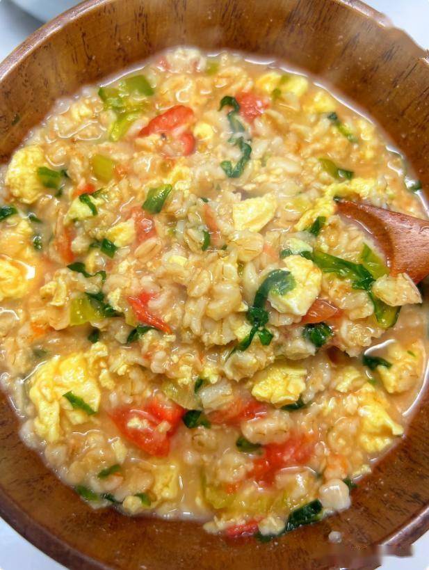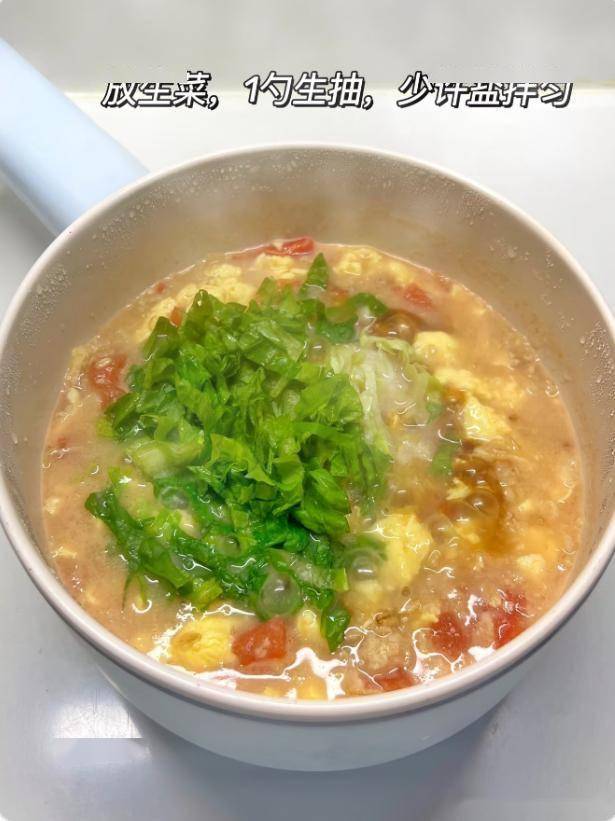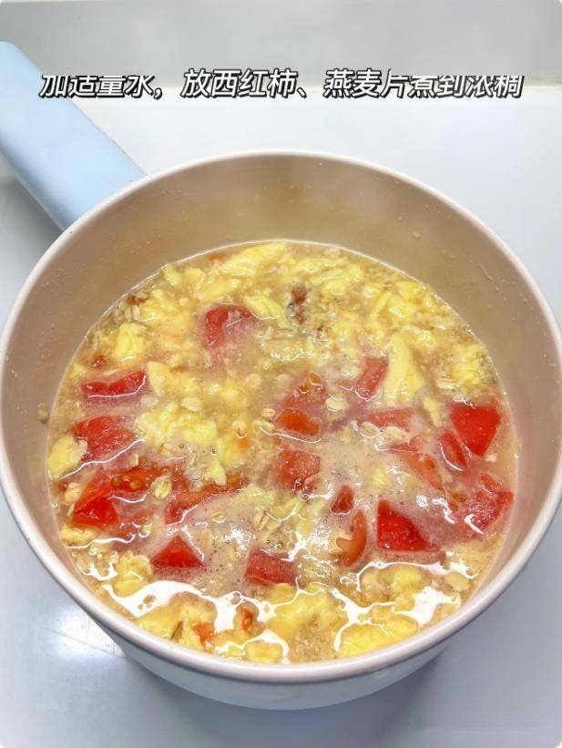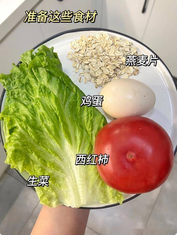 材料:适量番茄,适量鸡蛋,适量燕麦片,适量蔬菜,1勺生抽,少许盐。