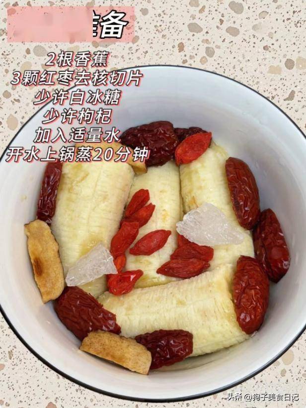 材料:2根香蕉,3颗红枣,少许白糖,少许枸杞,适量清水,