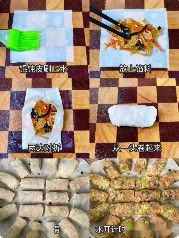 材料:适量馄饨皮,适量西葫芦,适量胡萝卜,1勺盐,适量木耳丝,鸡蛋碎,2勺虾皮,1勺生抽,1勺芝麻香油,