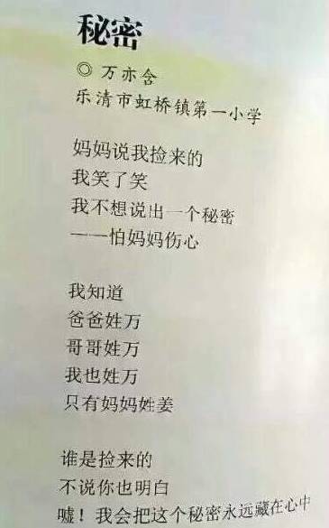 相信很多人在成长的过程中都会遇到过“你是捡来的”这样被家长应付的话语,《秘密》这首小诗不仅富有童真,更表达了对妈妈的爱,让人忍俊不禁却又感慨万千,在欢笑的同时带来了思考。