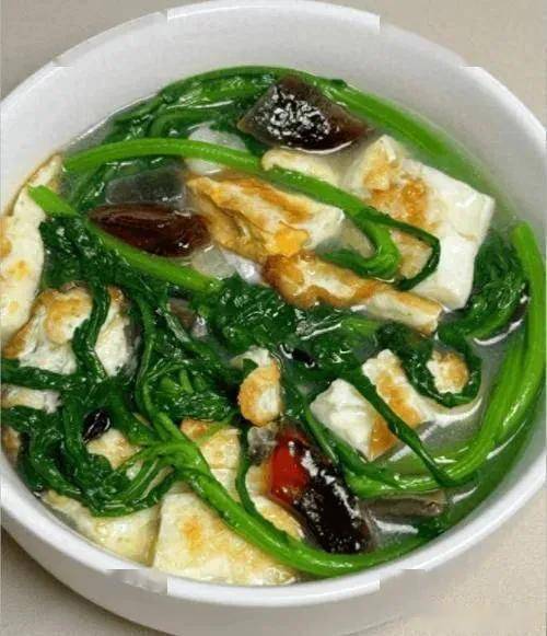 食材:茼蒿200克,干黑木耳10克,鲜百合1个,鸡蛋2个,枸杞10克,香油少许,盐适量。 1. 黑木耳提前泡发后撕成小朵,茼蒿洗净切段,百合剥片洗净,鸡蛋打散备用。 2. 锅中加清水烧开,先放入黑木耳煮5分钟,再加入百合煮2分钟。 3. 倒入茼蒿,待水再次沸腾后,淋入鸡蛋液形成蛋花,撒入枸杞,加盐调味,滴几滴香油增香即可。