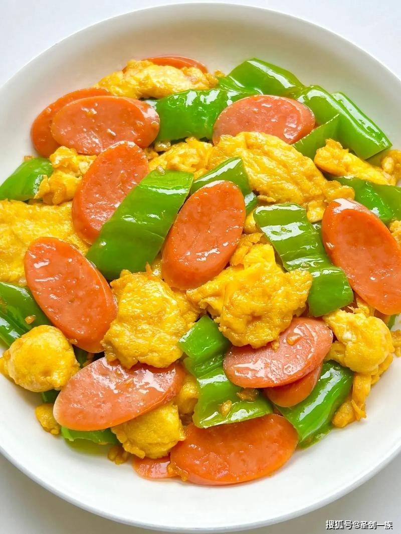 所需材料:鸡蛋 3个、火腿肠 2根、洋葱 半个、青椒 1个、红椒 1个(可选)、大蒜 2瓣、食用油 适量、盐 适量、黑胡椒粉 适量、料酒 1勺(可选)、生抽 1勺(可选)、鸡精 少许(可选) 做法步骤: 1. 准备食材:鸡蛋打入碗中,加入适量盐和黑胡椒粉,用筷子搅拌均匀,备用;火腿肠切成小丁;洋葱、青椒和红椒分别切成小块,蒜切末。 2. 炒鸡蛋:热锅凉油,油热后,将搅拌好的鸡蛋液倒入锅中,用筷子快速搅拌,使鸡蛋均匀受热。炒至鸡蛋凝固且金黄色,捞出备用。 3. 炒火腿肠:锅中再次加入少许油,放入火腿肠丁,中小火翻炒1-2分钟,直到火腿肠略微变色并且散发香味。 4. 炒蔬菜:加入切好的洋葱、青椒、红椒丁,继续翻炒2-3分钟,直到蔬菜变软,颜色变得鲜亮。 5. 加入蒜末:将蒜末加入锅中,继续翻炒,出香味。 6. 混合食材:将之前炒好的鸡蛋倒入锅中,与火腿肠和蔬菜一起翻炒均匀。根据个人口味可以加入1勺生抽和少许鸡精调味,再翻炒均匀。 7. 炒匀出锅:所有食材翻炒均匀后,尝一下味道,确保口味适中,最后翻炒1分钟后即可出锅装盘。