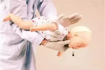 救护人应该马上把孩子抱起来,一只手捏住孩子颧骨两侧,手臂贴着孩子的前胸,另一只手托住孩子后颈部,让其脸朝下,趴在救护人膝盖上。在孩子背上拍1-5次,并观察孩子是否将异物吐出。