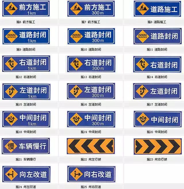 通告道路施工区通行的标志,用以提醒车辆驾驶人和行人注意。其中,道路施工区标志共有20种,用以通告高速公路及一般道路交通阻断、绕行等情况。设在道路施工、养护等路段前适当位置。