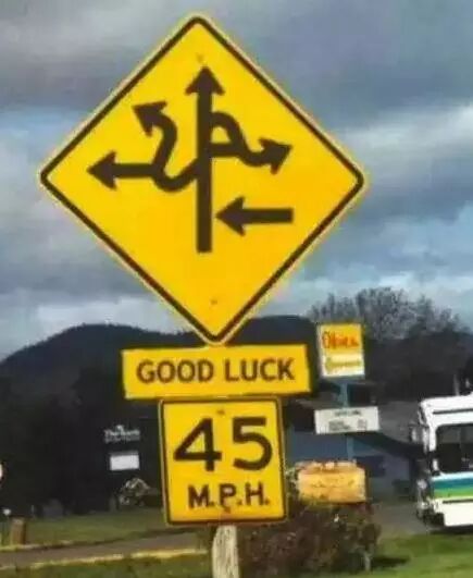 看到这个标志,忽然想到歌词“这里的山路十八弯……”下面的“GOOD LUCK”意思是说:祝司机好运?