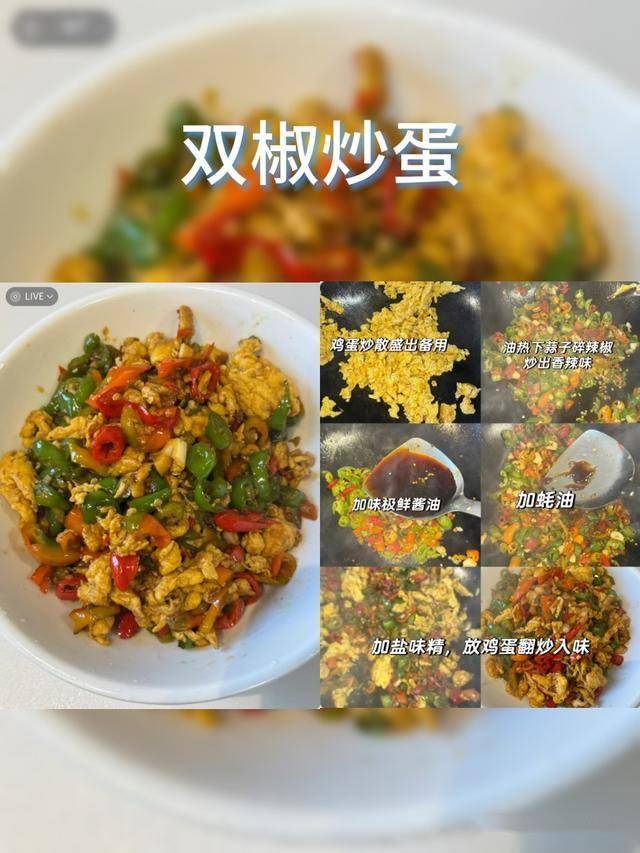 材料:3个鸡蛋,大蒜末,青椒,红椒,酱油,蚝油,盐,鸡精。