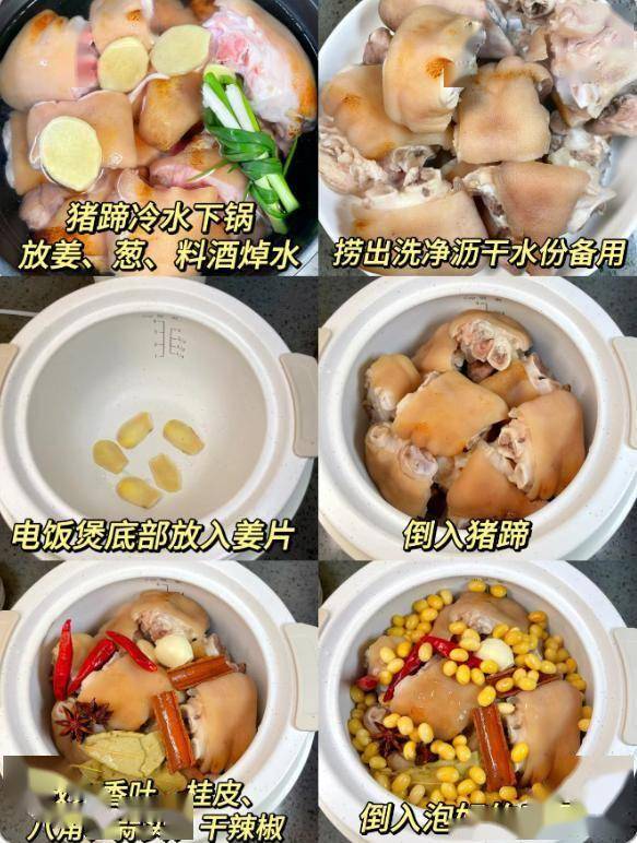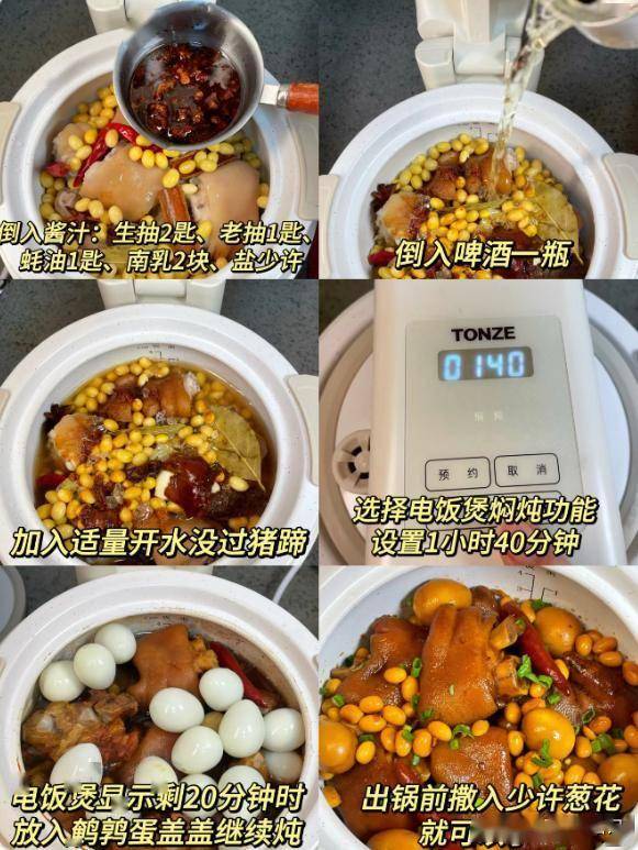 材料:一个猪蹄,生姜,葱,料酒,生姜,香叶,桂皮,八角,大蒜,干辣椒,一把黄豆,2勺生抽,1勺老抽,1勺蚝油,2块南乳,盐,一罐啤酒,适量鹌鹑蛋,葱花。