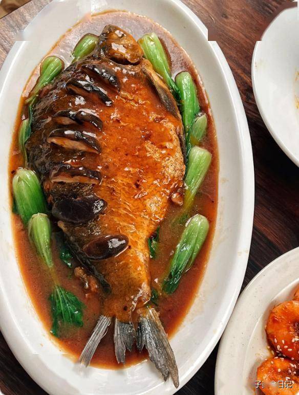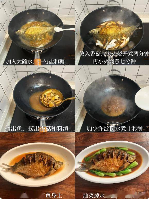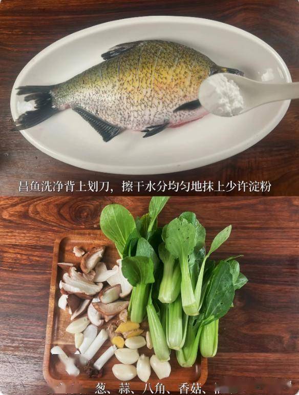 材料:一条鲳鱼,少许淀粉,一把青菜,生姜,葱花,大蒜,生抽,老抽, 黄酒,香菇。