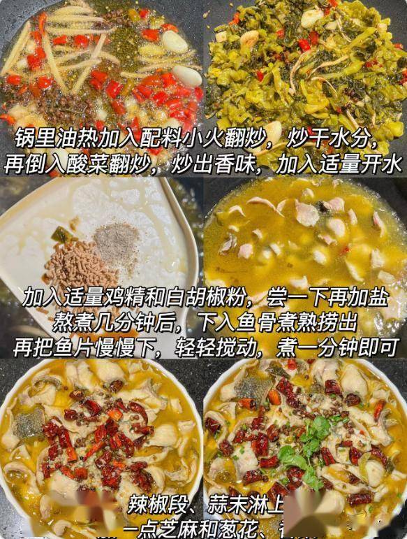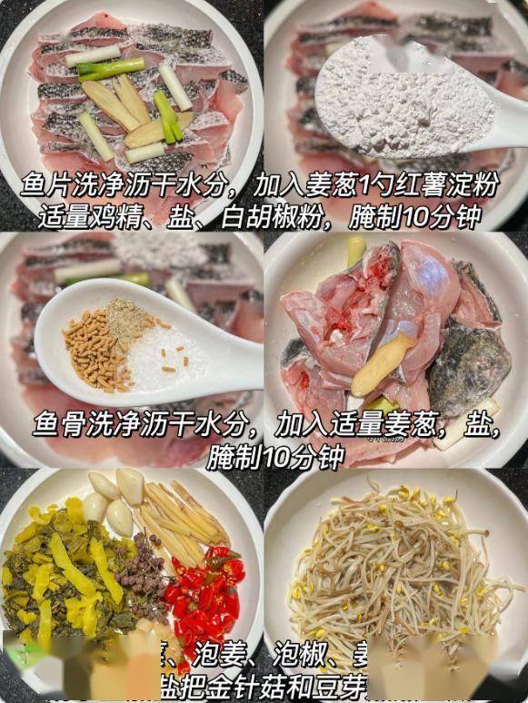 材料:适量鱼片,葱姜,1勺红薯淀粉,适量鸡精,盐,白胡椒粉,姜葱,盐,酸菜,泡椒,花椒,金针菇,豆芽,芝麻,香菜,热油,酸菜。