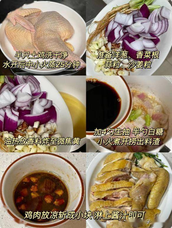 材料:半只土鸡,洋葱,香菜根,大蒜粒,沙姜粒,4勺生抽,半勺白糖。