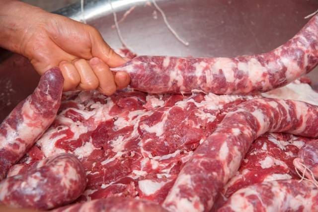 • 分段与结扎:灌满一根肠衣后,用绳子或棉线在香肠的适当位置打上结,将其分成若干段。每段香肠的长度可以根据个人喜好进行调整。