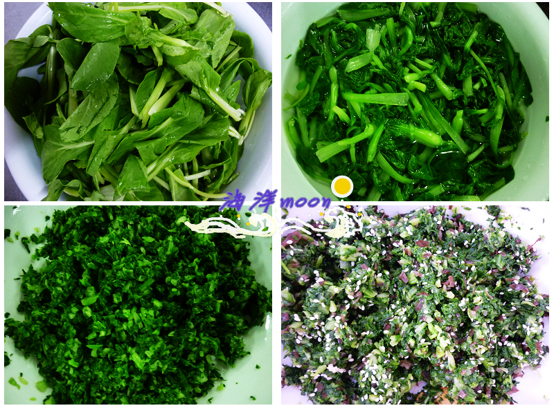 制作方法:青菜清洗干净,入开水锅烫一下捞出,过冷水凉透。沥干后剁碎,挤一下水分,加入剁碎的木耳和炒熟的芝麻【原本这道点心没有这两种配料,加了感觉口感更好】,最后放入糖,盐和猪油拌匀。