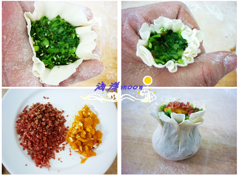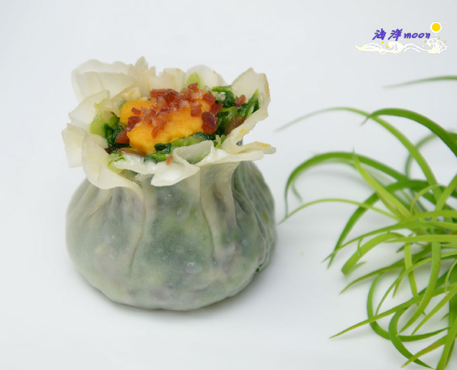 原料:面粉100克,青菜500克,木耳50克,猪油20克,咸蛋黄1个,火腿末适量,糖,盐适量。