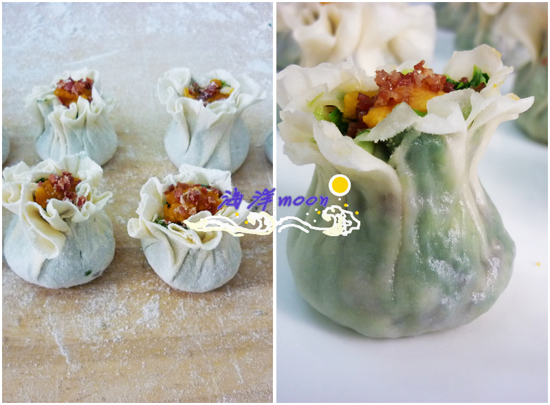 左手托起面皮,挑馅心放入面皮中间,包成烧卖形,放上咸蛋黄和火腿末点缀。