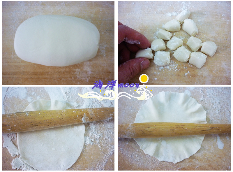 面粉用沸水烫成雪花面,再加点冷水揉成面团。下成小剂子,用两头细的擀面杖擀成中间稍厚,边缘较薄的荷叶形圆皮。