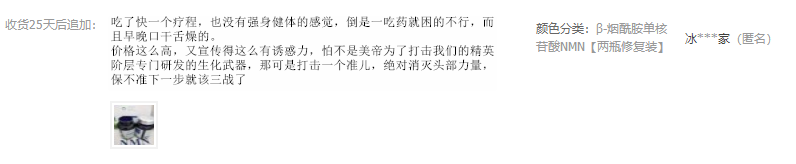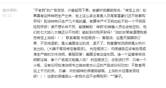 相信这位大哥在写淘宝评论的时候,也对NMN丧失了信心,以至于最后气急败坏地写出两个字:“骗子!”