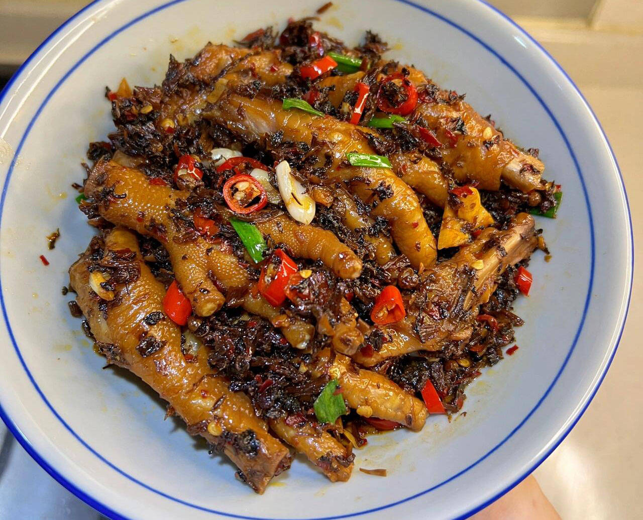 食材:鸡爪、梅干菜、葱姜蒜、小米辣、干辣椒末;