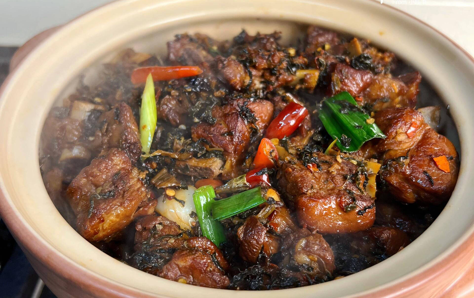 食材:梅干菜、排骨、葱姜蒜、蒜苗、八角、小米辣、干辣椒;