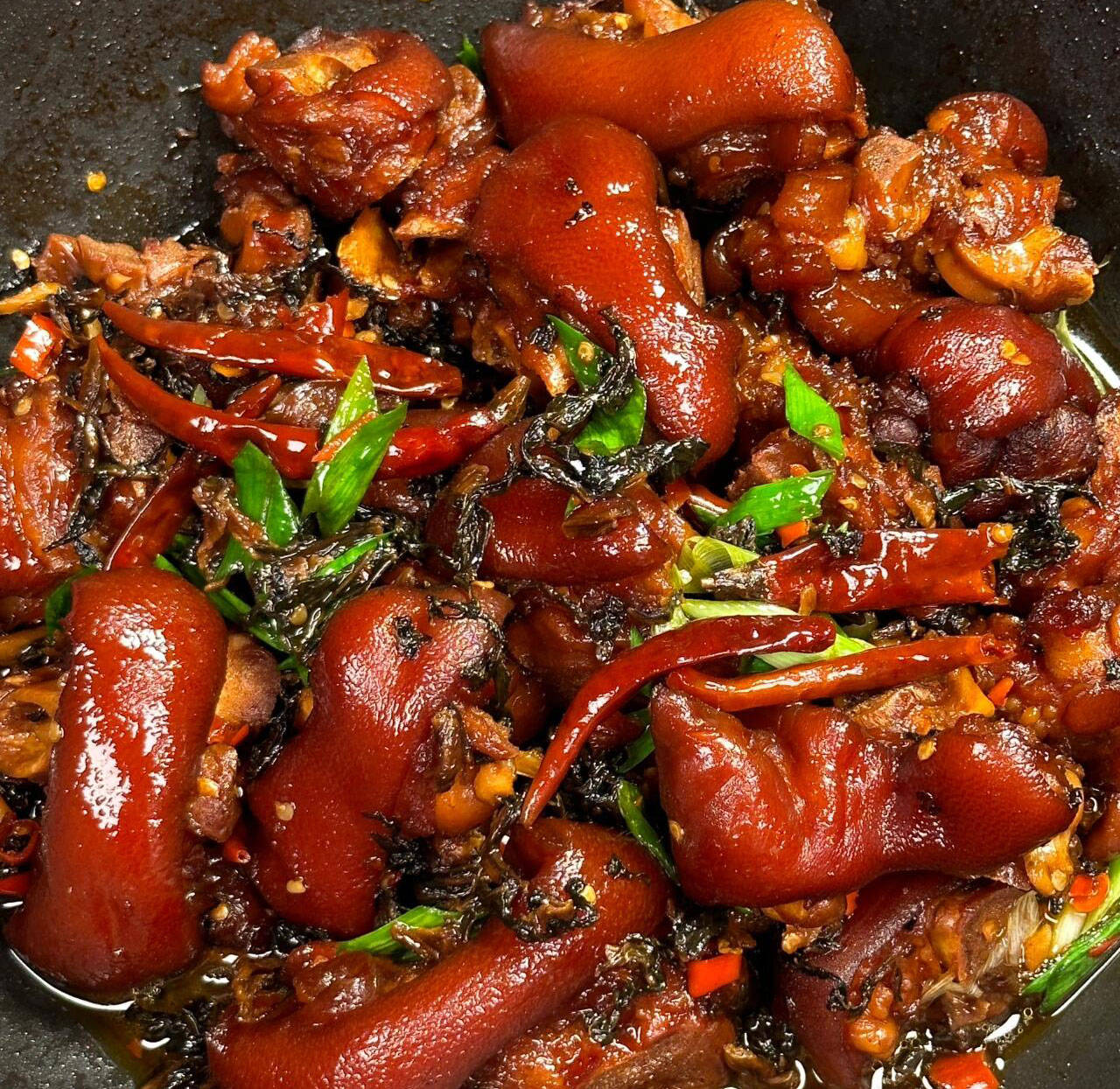 3、锅烧热无油,倒入洗干净的梅干菜炒干水分炒香盛出,锅中少油,姜蒜辣椒爆香,倒入猪蹄,把猪蹄回一个锅,调味加点盐,生抽➕蚝油➕胡椒粉➕鸡精➕一勺辣椒面,倒入梅干菜翻炒均匀,接着倒入压猪蹄的原汤继续焖煮3分钟,出锅前加葱或蒜叶即可