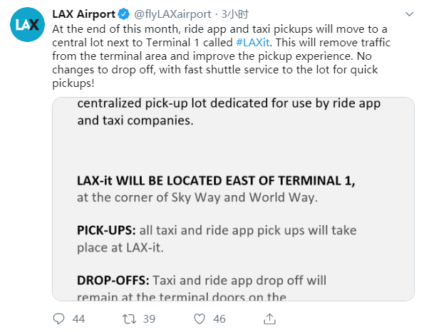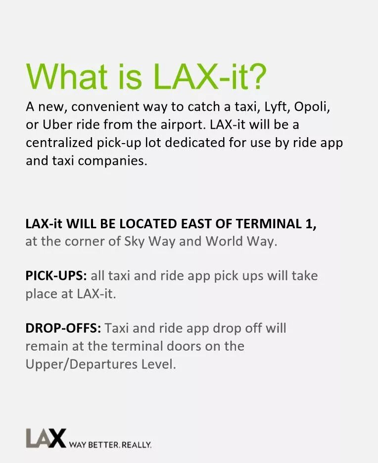 洛杉矶国际机场在官方推特上表示,在本月月底的时候,网约车和出租车的接客服务将移到1号航站楼旁边的中央区域,名叫LAX-it,这将会减轻航站楼的交通和改善接客的体验,下客方式没有改变,有接驳巴士会把大家送到上车区域。