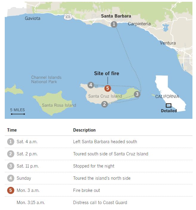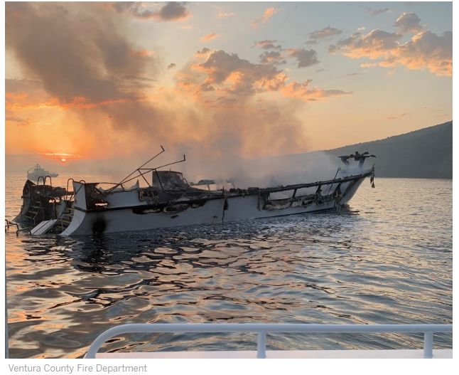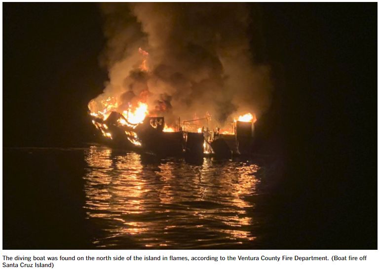 周一凌晨,南加州圣克鲁斯岛附近一艘潜水船——概念号——发生火灾。