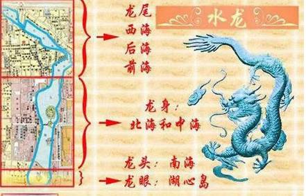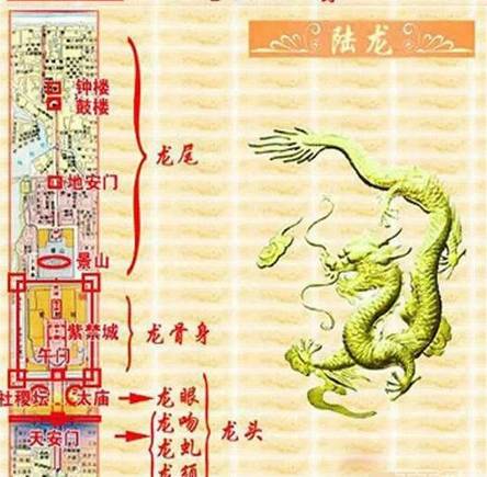 北京的“双龙”,水龙以南海为龙头部分,湖心岛是龙眼,中南海和北海构成龙身,什剎海是龙尾,摆向西北方向。陆龙俯卧在北京的中轴线上,天安门宛若龙吻,金水桥为龙的颔虬,东西长安街仿佛龙的两条长须,从天安门到午门一带是龙鼻骨部,太庙和社稷址如同龙眼,故宫恰似龙骨龙身,四座角楼好像是龙的四爪,伸向八个方向,景山、地安门大街和钟鼓楼构成龙尾。