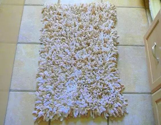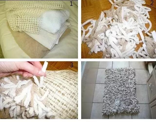 先将毛巾剪成小条,然后系在网格上,不用一针一线就能够做成浴室脚垫!