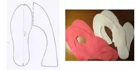 找两个毛巾按照下图左边实线剪,鞋底可以直接剪下来,剪鞋面的时候要先把毛巾折叠,虚线处是折痕处。