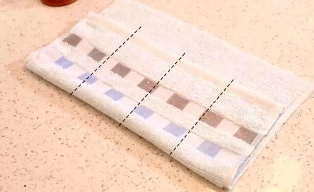 做收纳袋的时候,先将毛巾折一下,在虚线的位置缝上几针。