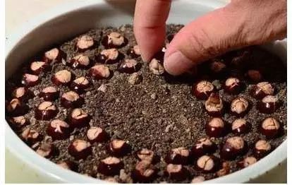 3.找个器皿,装上湿润的泥土,将泡过的柚子籽摆好在器皿中,小头要朝上。